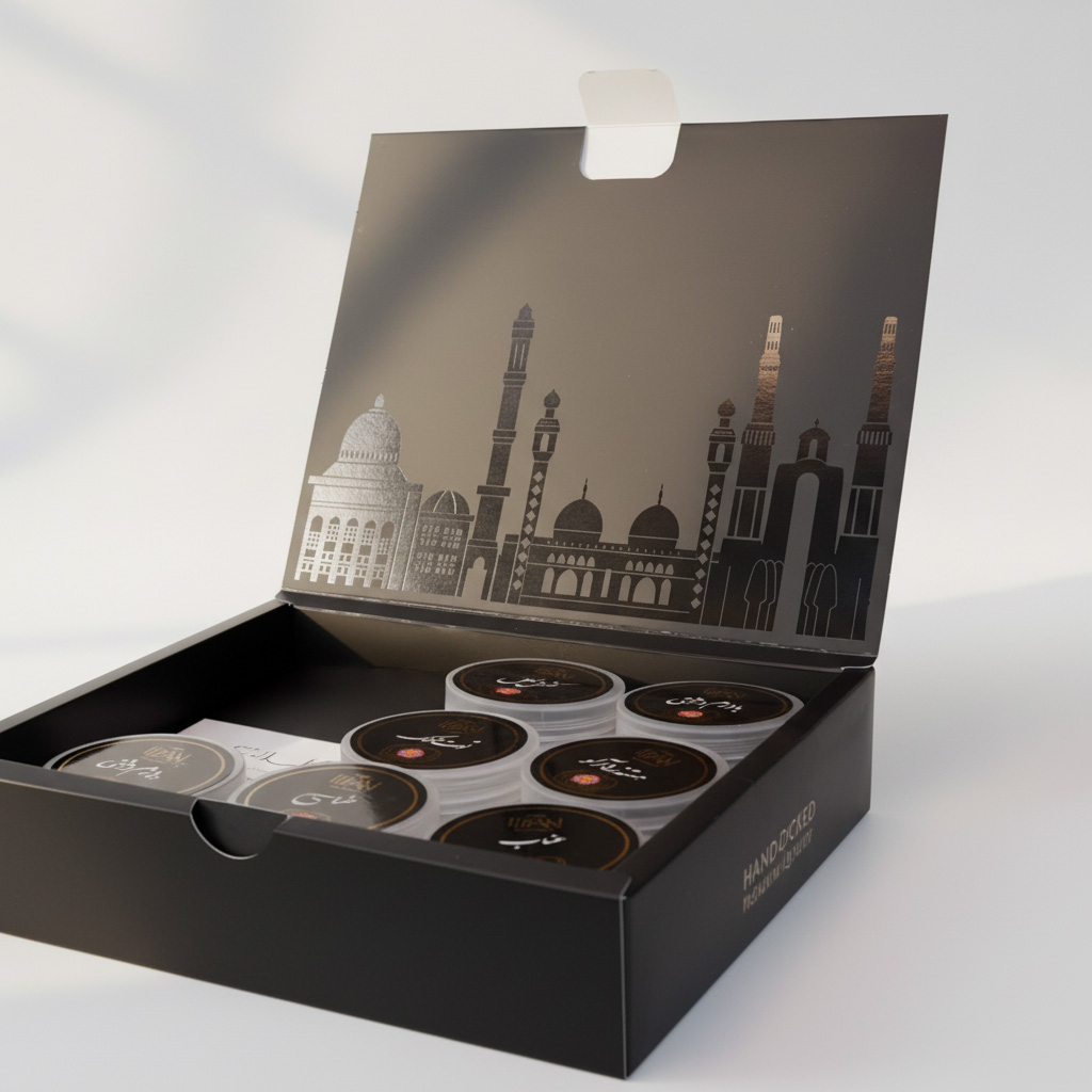 نقوش تزئینی بهکاررفته، برگرفته از معماری اسلامی و کاشیکاریهای سنتی منارهها هستند که در کنار ساختار مدرن بستهبندی، ترکیبی متوازن از سنت و طراحی معاصر را ایجاد کردهاند. استفاده از رنگ زمینه تیره در کنار جزئیات طلایی و الگوهای ظریف، حس وقار، اعتماد و کیفیت بالا را به مخاطب منتقل میکند.