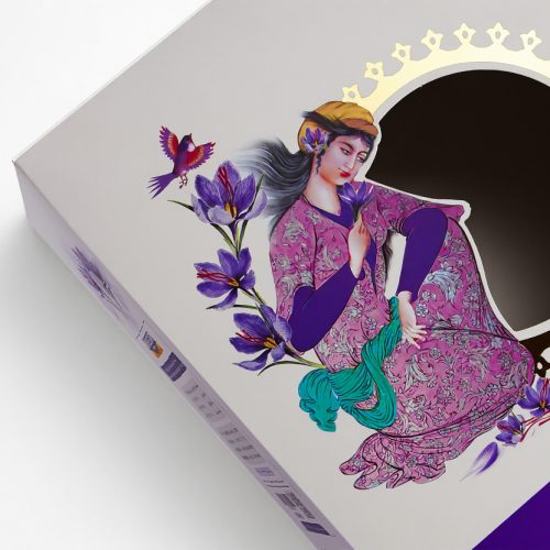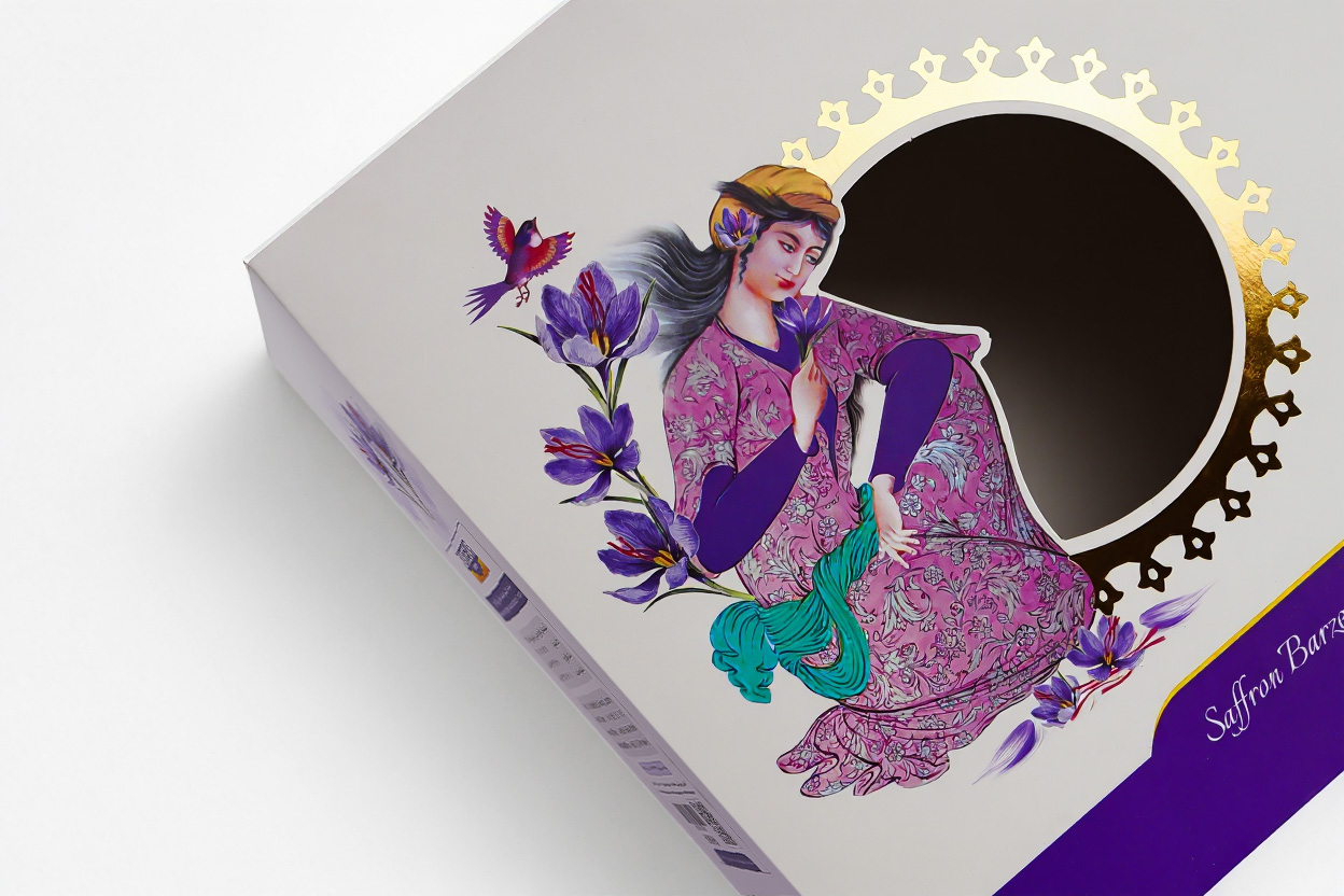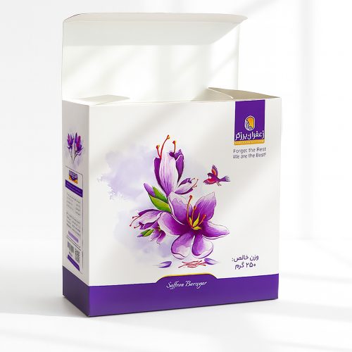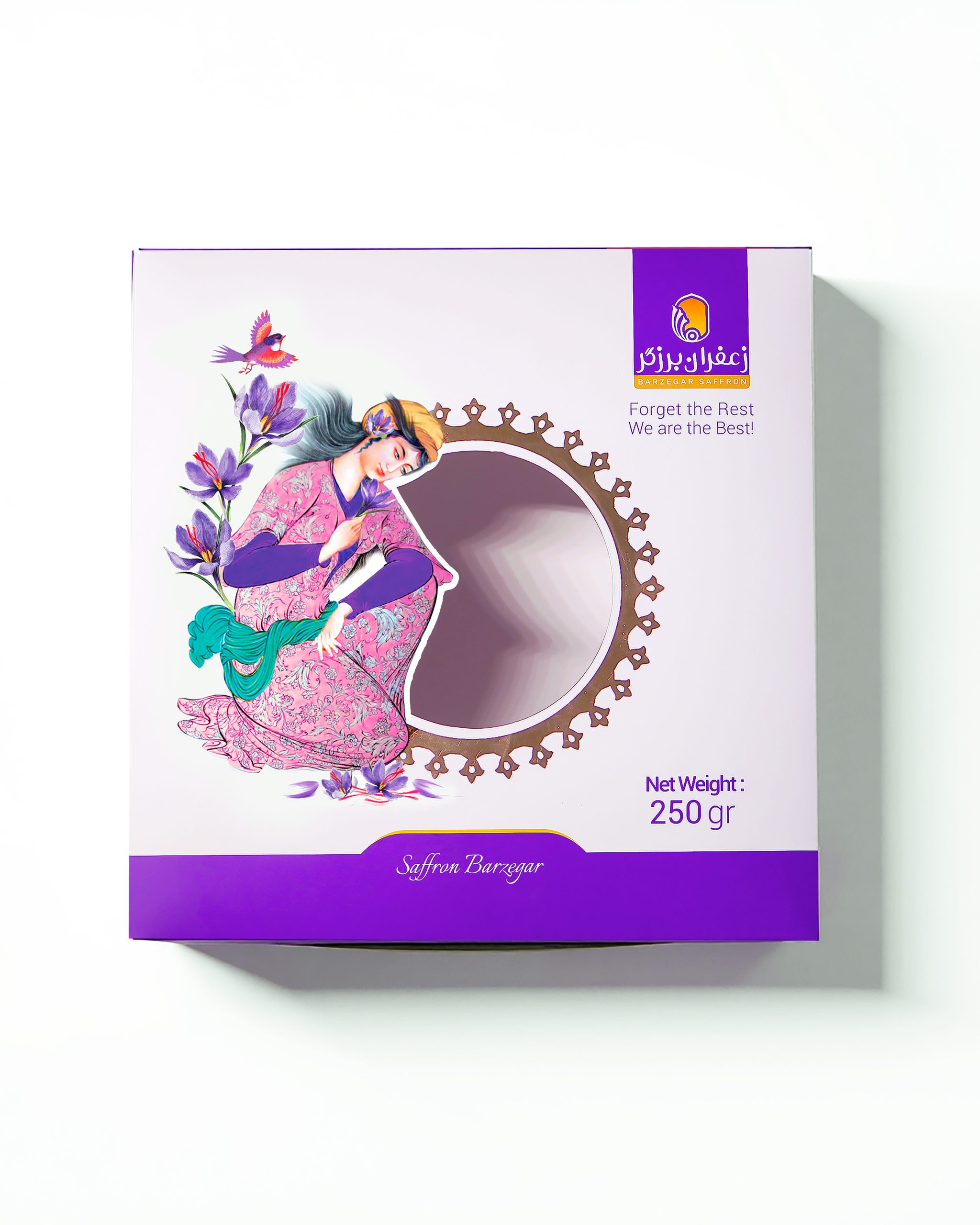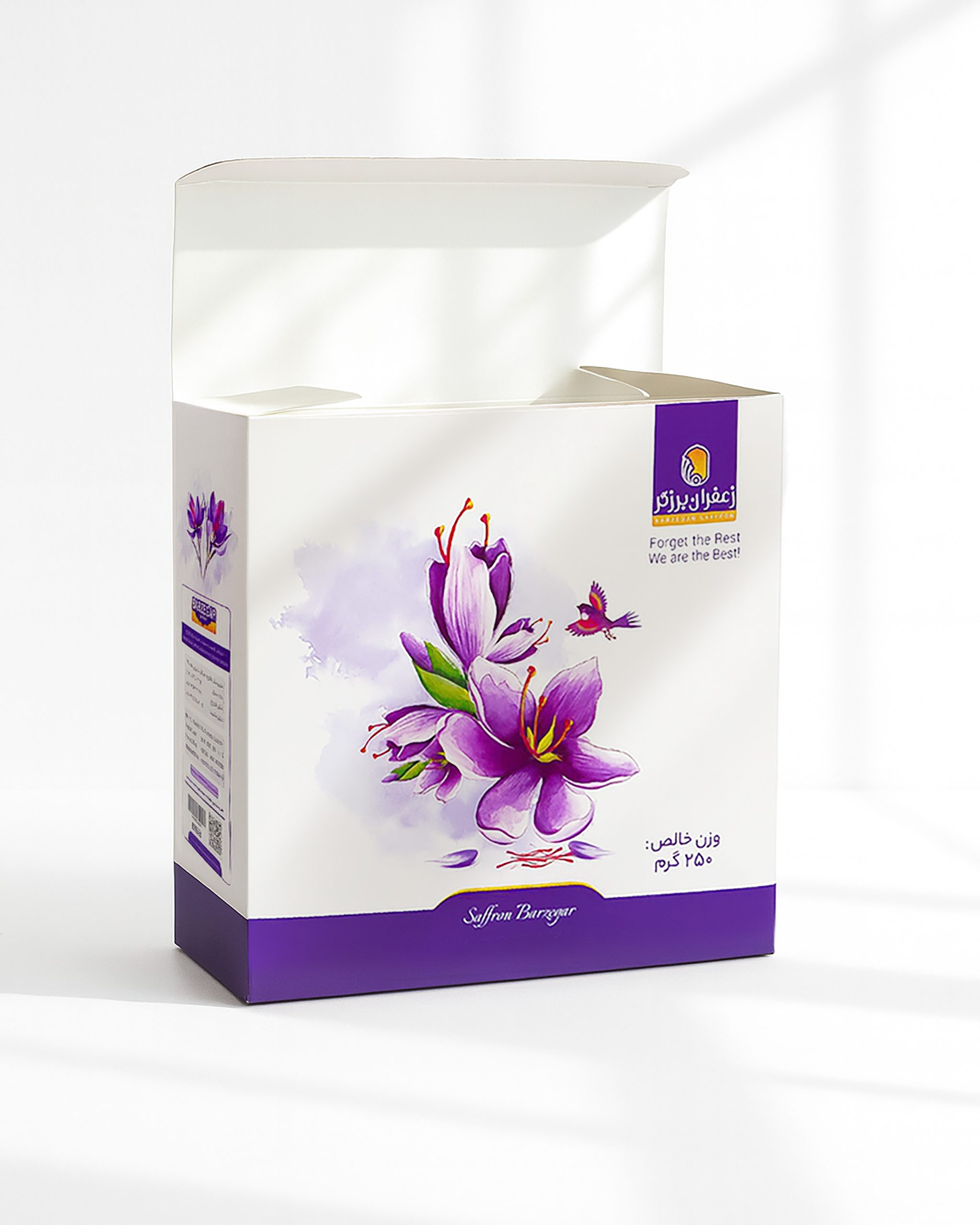 طراحی و اجرای بسته بندی زعفران فله وزن ۲۵۰ گرم به سفارش برند زعفران برزگر .